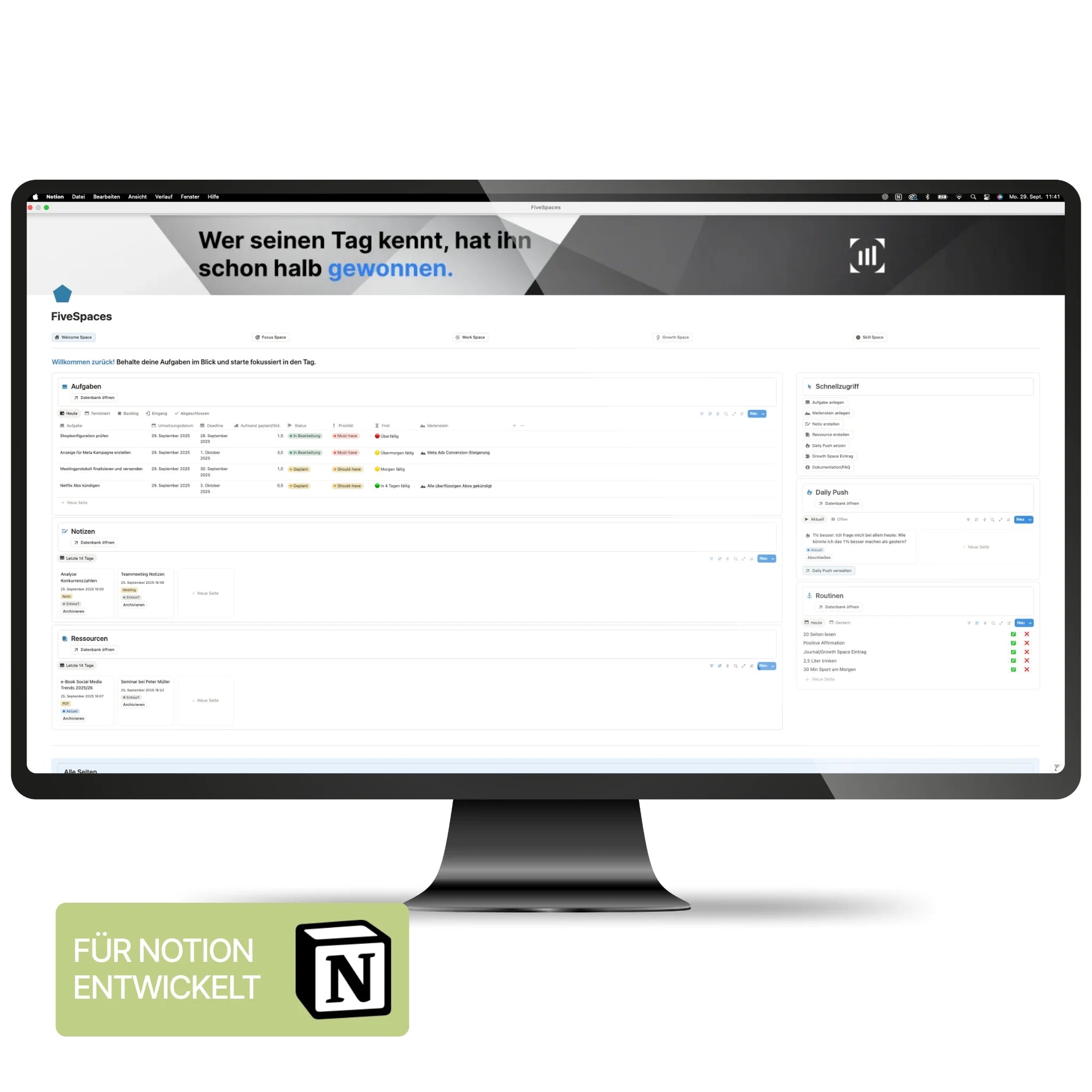 Während viele vergleichbare Produkte mit einer Vielzahl an Vorlagen und Modulen versuchen, alle Lebensbereiche gleichzeitig zu kontrollieren, setzt FiveSpaces auf eine klare und durchdachte Struktur. Das System basiert auf bewährten Methoden aus Managementliteratur, Organisationspsychologie und Selbstführung und übersetzt sie in ein digitales Dashboard, das dich Tag für Tag ins Handeln bringt.