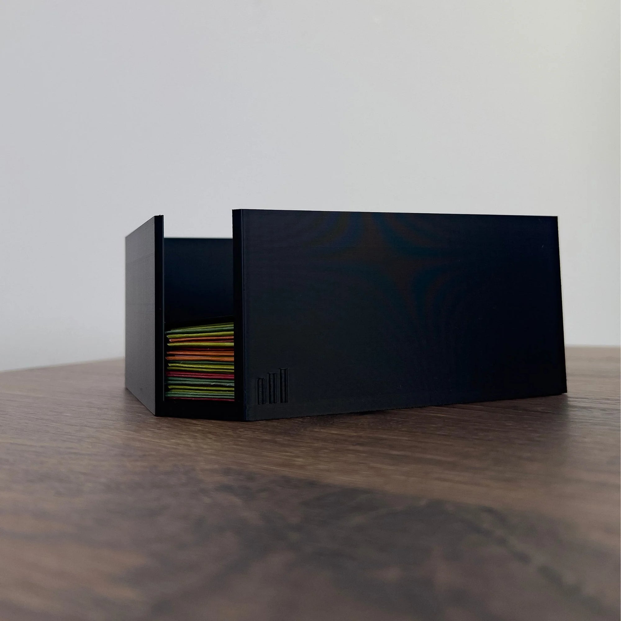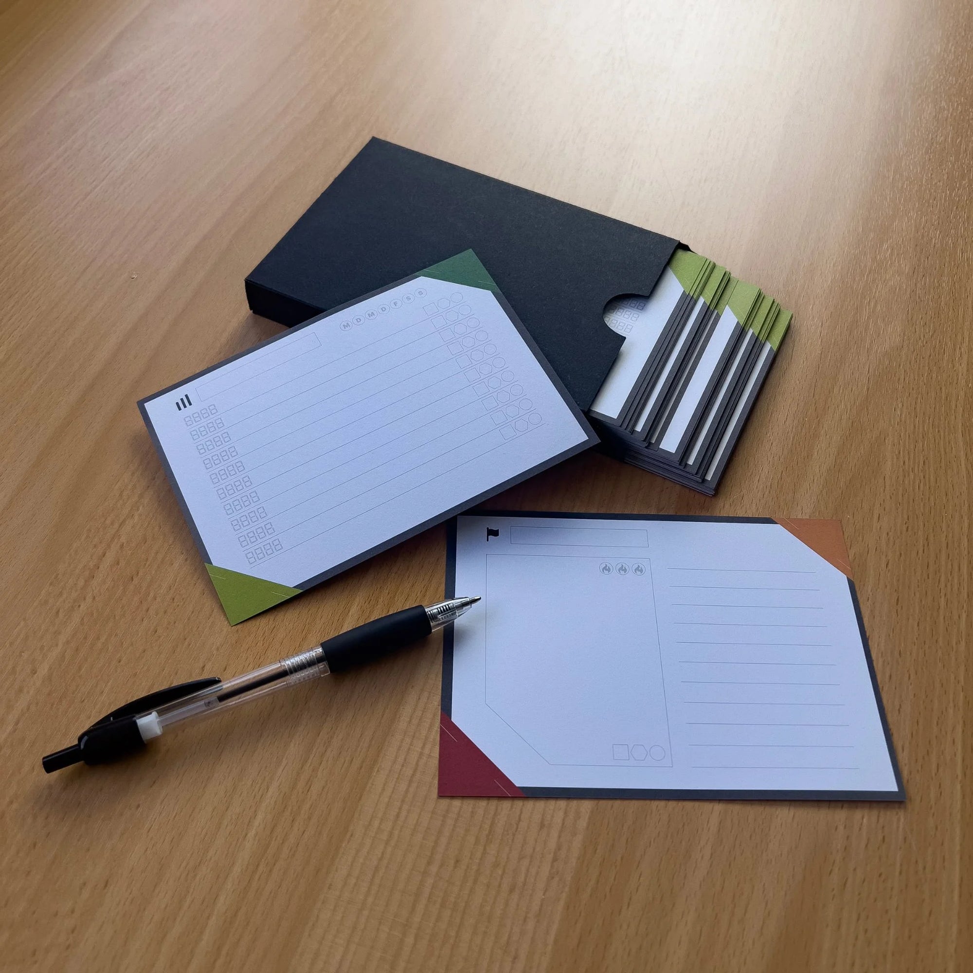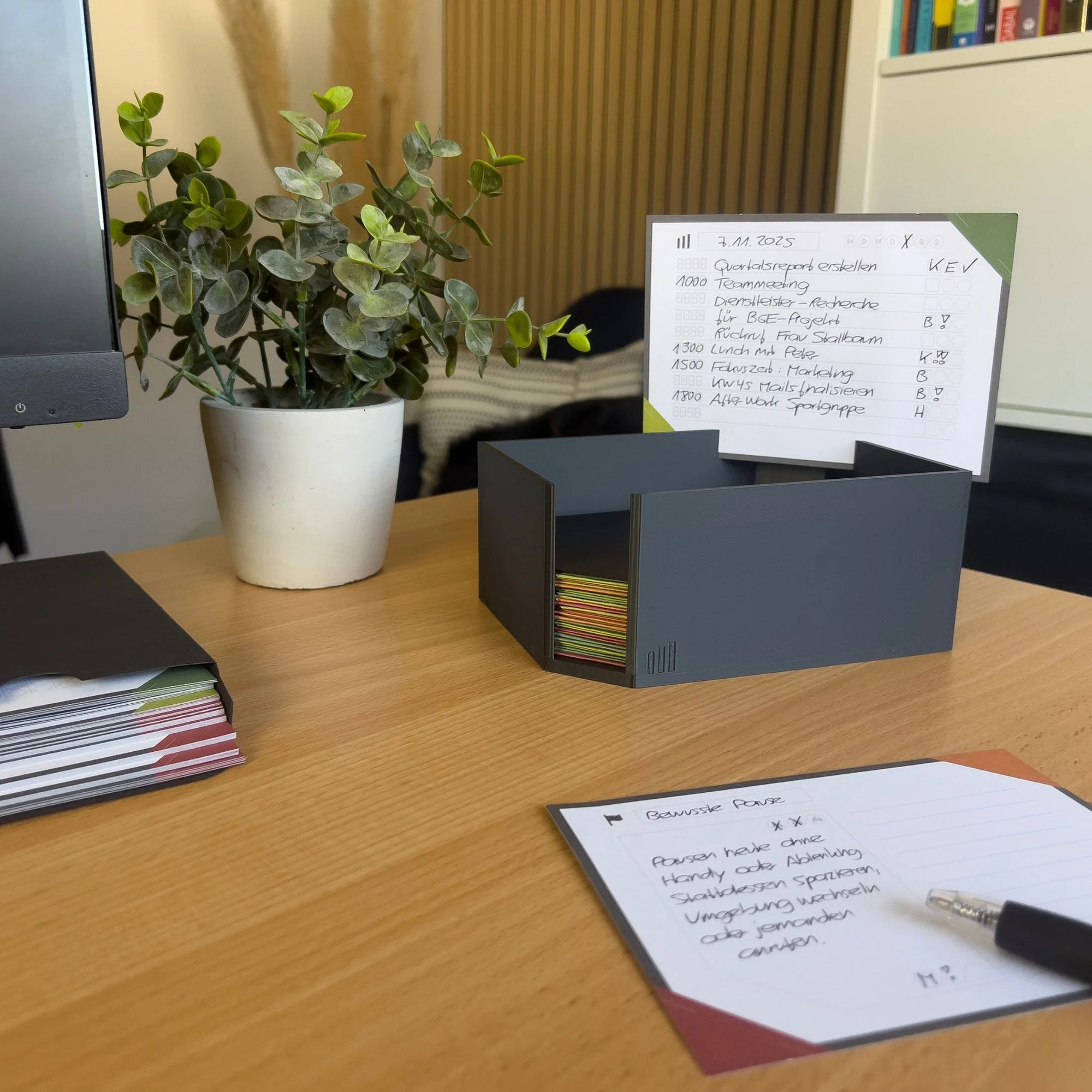 Die zugehörige Daily Box ist nicht nur ein Hingucker auf deinem Schreibtisch, sondern ein zentrales Element, damit sich die Wirkung des Systems vollständig entfalten kann. Du kannst bis zu zwei Karten auf der Box fixieren (z. B. den aktuellen Tag und den Vortag), damit du alles Wichtige direkt im Blick hast. Am Ende eines jeden Tages faltest du die Karte mithilfe des SmartFolds – der zugleich als Sichtschutz dient und die Karte auf der Box fixiert – und legst sie anschließend in die Box. Durch die sichtbare Farbkante, mit der du den Tag bewertest, entsteht über die Zeit eine klare Übersicht über deinen Verlauf und deine Entwicklung. Die Daily Box wird so zu einem visuellen Fortschrittsindikator, der dir hilft, jeden Tag bewusst zu gestalten.